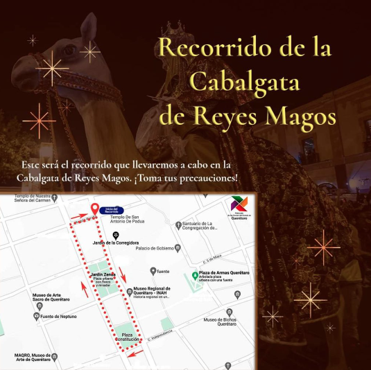 El patronato de las fiestas del Estado de Querétaro informó que este viernes se registrarán cierres viales con motivo de la cabalgata de reyes magos. Será a partir de las 17 horas cuando comiencen los cierres vehiculares en las calles del centro histórico. El recorrido de la tradicional cabalgata del Día de Reyes iniciará a partir de las 19 horas y se realizará por las calles Ángela Peralta, calle Juárez, Corregidora e Independencia. Se exhorta a los automovilistas tomar vías alternas.